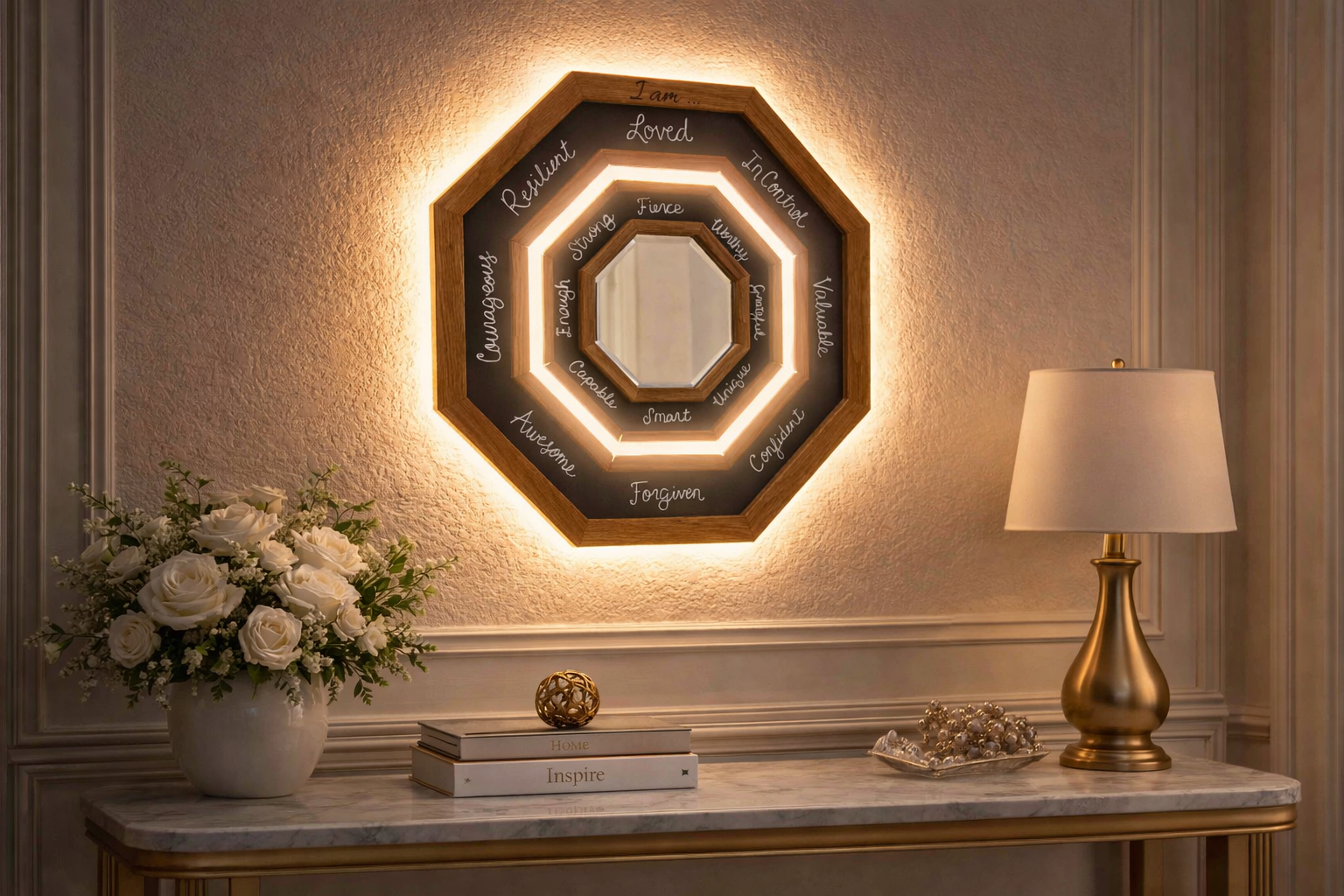 What started as an AI generated image created and supplied from the client, was brought to life by us. The aspiration mirror is a hand crafted mirror. It is made with white oak. The mirror lights up both from the front as well as from the back. The mirror contains 16 personal aspirations supplied by the client. These aspirations were all hand painted within the mirror to be a constant reminder to the client that they are an amazing human being.